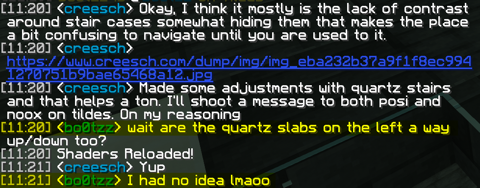 creesch Link@Positive @Noox I think you did a lovely job on the trading hall so far! One thing I did notice though is that I keep getting turned around finding the lower levels. The reason, I think, is...@Positive @Noox I think you did a lovely job on the trading hall so far! One thing I did notice though is that I keep getting turned around finding the lower levels. The reason, I think, is because the stair cases lack some contrast which basically hides them unless you are standing at exactly the right spot.