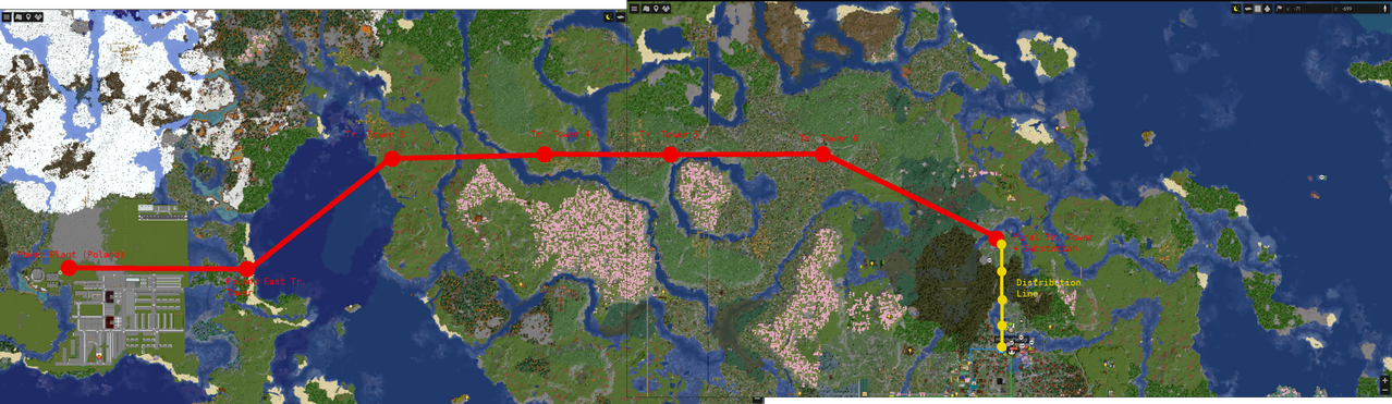 To avoid having just 1 whole transmission circuit just for a tiny town, would anyone feel like copying the schematic of my distribution tower after I hook it up and creating clones of it (+ straight cabling) every ~500 blocks to the east all the way to the industrial district?