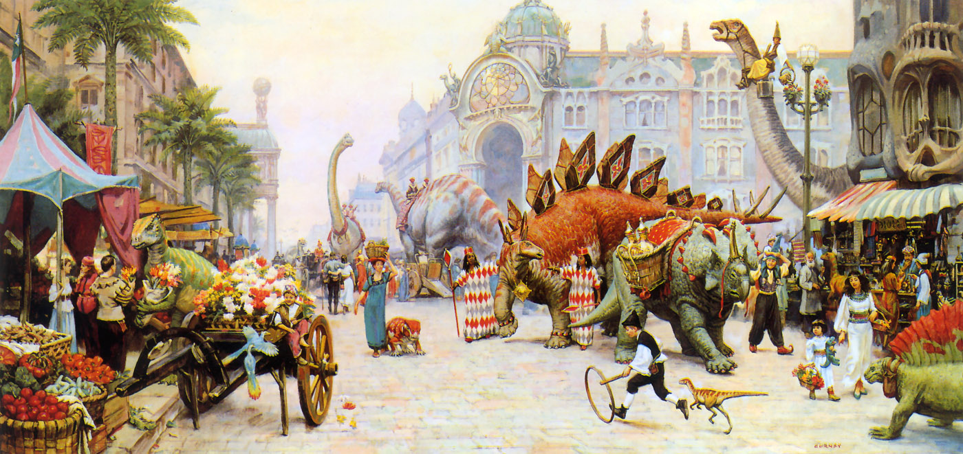 Perhaps a little more mature than you are looking for, but Dinotopia: A Land Apart from Time is a beautifully illustrated children's book about an island where humans and dinosaurs live in harmony. The author has a fantastic imagination, and the amount of detail that goes into the world-building is amazing. I mean, just look at this, this, and this. It's written in the first person as a travel journal by the main character. If you are planning to get the book, get the hardcover version. It has better quality for the art.