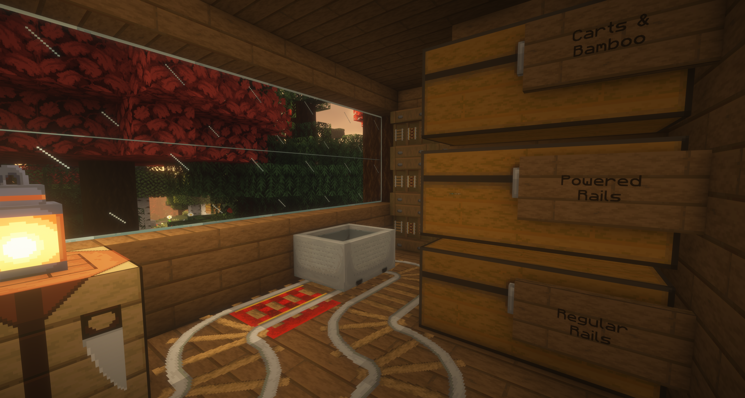The "Tildestown Railroad Enthusiasts Headquarters" is now open for business on the first floor of the Vandelay Condos! If you're interested at all in trying out the faster rails new to this season, swing by and grab some supplies! We've got it all -- Rails, powered rails, carts, bamboo blocks, redstone, and most importantly a train emoji on our sign!