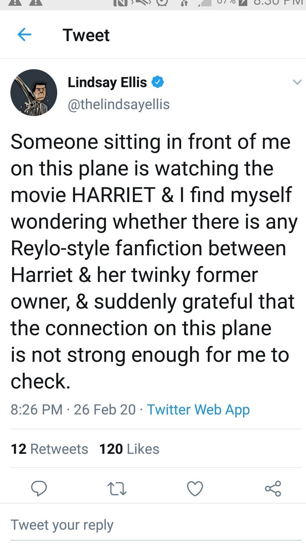 She pondered in a tweet if anyone on the internet were terrible enough to have written ship fanfiction for the movie Harriet, like there's a lot of fanfiction out there for an unrelated popular ship that she considers abusive. But of course after this tweet has gone through the phone tag game of cancelling, it's being described as that she wrote fanfiction glorifying slavery. screenshot of the deleted tweet And she did apologize for this this tweet anyway, as the comparison does still make light of real historical brutalities. link to the timestamp of her video apology