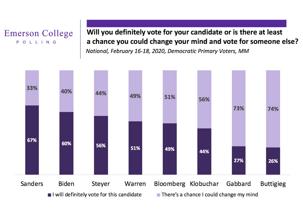 To be fair he was frontrunning at around 30% support for practically the entire race until Iowa, meaning his core base is pretty large. More interestingly, his base is also the second most committed to their candidate, only behind Sanders' base. Granted the youth vote is still pathetic with Biden.