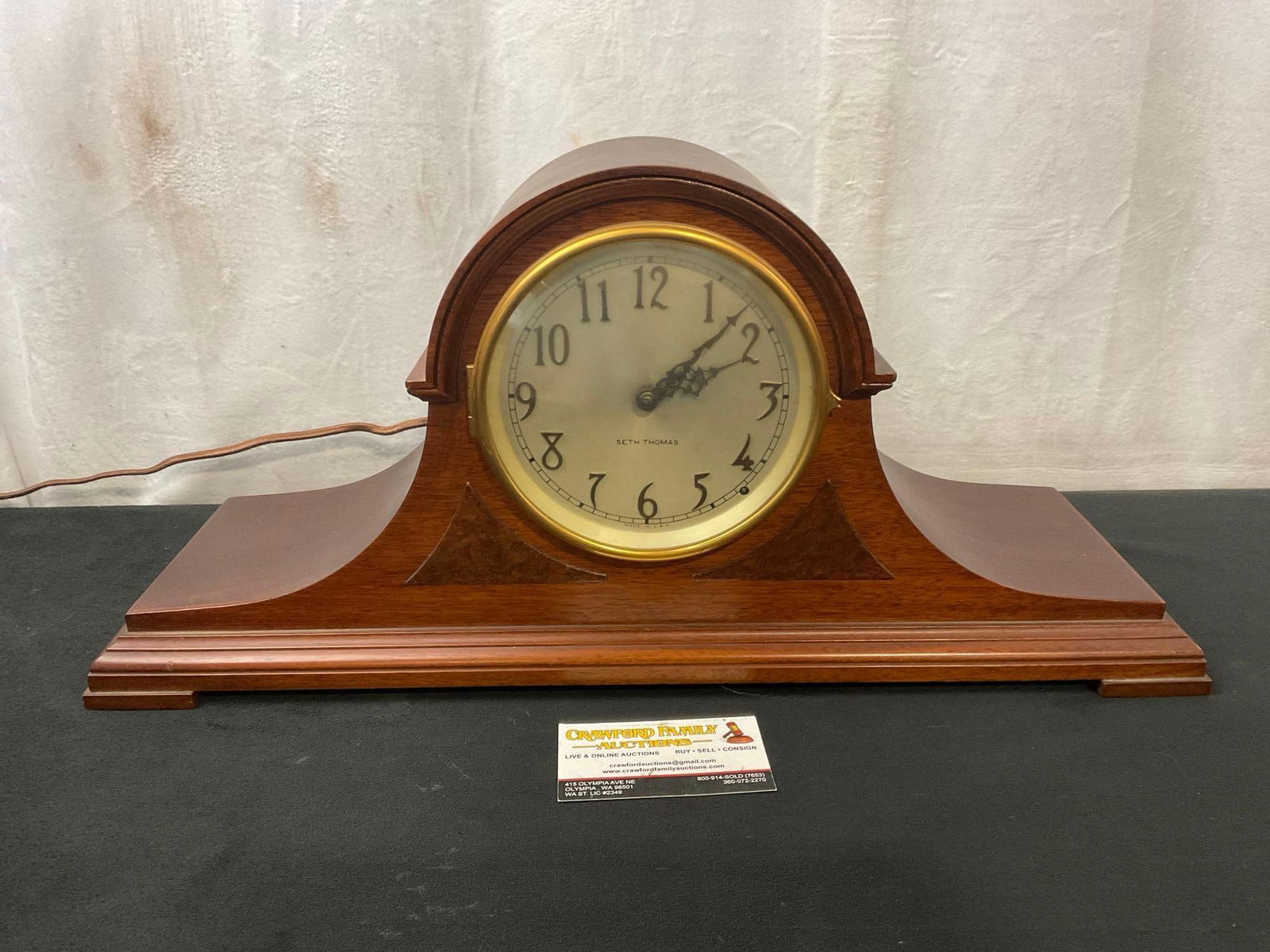 I was dumpster diving for a scrap piece of wood about 20 years ago and was quite surprised to find that someone had tossed a Seth Thomas Electric Mantle Clock in the dumpster. I took it home, cleaned it up and repaired a tiny piece of trim that was broken and it looks great, works perfectly. It has multiple chimes for quarter hour and hour chime. Looks very similar to this one