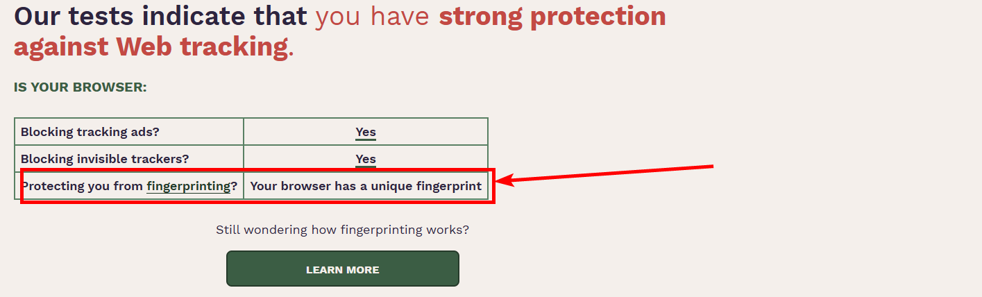 You need to look a bit closer to the results. When I test with a regular browser and ublock installed I already get that result, but that is not about fingerprinting specifically. Under that line praising you is a bit more detailed breakdown highlighted in this screenshot.
